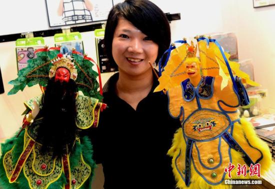 4月13日,中新社記者探訪位于福州馬尾馬限山的“左營佐贏”海峽兩岸(船政)文化創意產業園。“左營佐贏”園區起自船政文化博物館,依馬限山而建,佔地約13畝、建築面積約4200平方米,是一條具有船政特定歷史時期(1866年∼1920年)風格的街區。民宅、教堂、名人故居、亭、臺、樓閣和當時在馬尾出現的英、法建築錯落山道。自貿區的虹吸效應正在展現,令該園區一開張就“引鳳”14家臺企,入住率高達九成。圖為該產業園臺灣文創美學館負責人展示布袋木偶。 (中新社記者 劉可耕 攝)