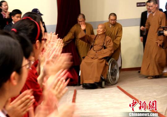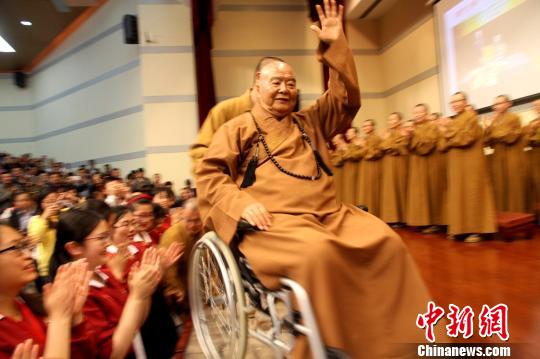 圖為星雲大師向聽眾致意。 崔佳明 攝