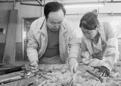 鄭銀聘(左)在傳授徒弟雕刻技藝。 本報記者 劉深魁攝