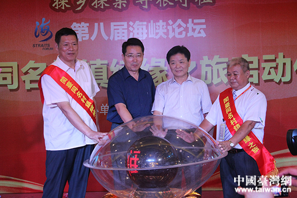 中國臺灣網6月11日廈門訊 (記者 蕪同)在當今世界的人類歷史上有一個奇特的現象:有一個族群,幾百年前為生活所迫,歷經千難萬險跨海去對岸討生活,但仍然日夜思念祖籍地,于是他們就把自已新的居住地命名為故鄉的村鎮名,以示永不忘本,並寄托濃濃的鄉愁;從此,在海峽兩岸出現了600多個相隔大海、但完全一樣的同名村鎮。6月10日晚,“第八屆海峽論壇 閩臺同名村鎮續緣之旅”啟動儀式在廈門舉行。本屆閩臺同名村鎮續緣之旅,邀請了臺灣同名村鎮鄉親380人來福建探親謁祖、修撰族譜、考察交流、敘緣聯誼。閩臺兩地的對接村鎮也由去年的28對,擴大至76對。閩臺同名鄉鎮鄉親和有關人士400多人出席了啟動儀式。