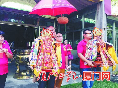 “新女婿”第一次見“岳母”,禮數不能少。海滄福龍宮管理者謝海煌說,土地公婆“回娘家”,備了水果、餅幹、香花,還有廈門特產黃則和餡餅、鼓浪嶼餡餅。廟里還專門請人做了幾尊漆線雕紀念品,雕著土地公的塑像,送給“娘家”宮廟。謝海煌說,以後還打算做土地公婆合影的塑像。至于土地婆“出嫁”時的福龍三寶——新婚紅傘、福雞帶路、福德錢母,這次“回娘家”也帶著。新婚紅傘寓意婚姻美滿家庭和睦,放在花籃中的“帶路雞”意味著好命、長久,福德錢母則寓意賺錢如賺水、財源滾滾來。