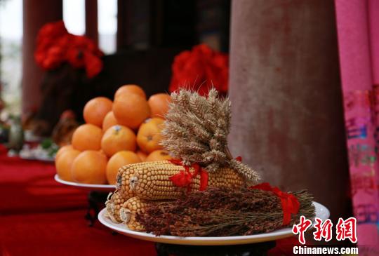 6月21日,甘肅天水卦臺山上旗幡招展,古樂悠悠,2016(丙申)年卦臺山民間祭祀伏羲典禮當日舉行。圖為祭祀物品。 丁思 攝