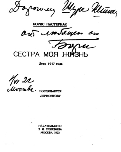 詩集《生活,我的姐妹》扉頁,帶有贈給亞·施蒂赫的題詞。