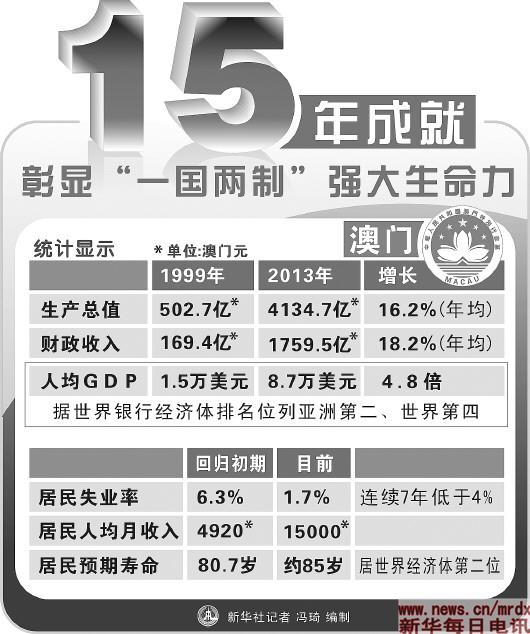 統計顯示,從1999年到2013年,澳門本地生產總值由502.7億澳門元(以下簡稱“元”)增至4134.7億元,年均增長16.2%;財政收入由169.4億元增至1759.5億元,年均增長18.2%;澳門人均GDP由1.5萬美元增至8.7萬美元,增長4.8倍,據世界銀行經濟體排名位列亞洲第二、世界第四。