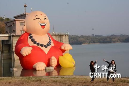 據中評社報道 臺南烏山頭水庫風景區迎新春,制作了一座高15公尺高的世界最大“水財神”,11日下午在水庫湖面水面成功充氣,許多遊客目睹後直呼幸運,希望今年遇水大發、賺大錢。