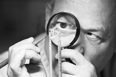 為迎接農歷羊年的到來,臺灣雕刻家陳逢顯歷時半年多,用樹脂雕刻完成一只大陸的藏羚羊和一只臺灣的長鬃山羊,以此祝福兩岸同胞新年喜氣洋洋。其中“藏羚羊”長1.8毫米、寬0.6毫米、高4毫米;“長鬃山羊”長0.8毫米、寬0.4毫米、高0.7毫米。兩只羊可以“站”在鉛筆尖上,需要借助放大鏡才能看清楚。圖為2月17日,雕刻家陳逢顯在新北市家中創作。