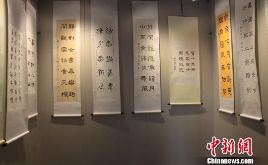 1月18日,“新市民新課堂”公益性藝術輔導培訓活動7周年成果匯報演出《我們的課堂》在濟南市群眾藝術館群星劇場舉行。圖為書法班學員作品展覽。 楊曉衛 攝