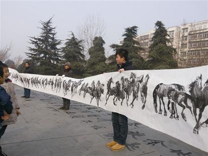 昨日上午,隨州書畫家楊文明耗時3個月創作的25米長的《駿馬圖》亮相隨州神農公園,吸引了眾多市民圍觀。