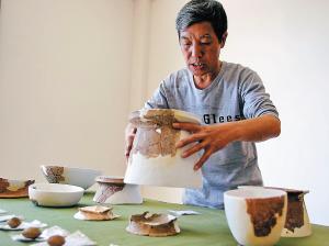 橋山遺址出土的陶片拼接修復的陶器。 本報記者 武威 攝