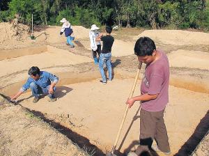 1月16日,記者趕往陵水橋山遺址處,在新一輪發掘現場,中國社科院考古研究所研究員傅憲國,帶著考古隊員張小波、鄭雲峰、徐浩寧等人正在進行土層切片。而周圍仍是大片大片的芒果、西瓜地。