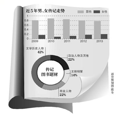 數據顯示,在5年累計的總榜單中,文學歷史人物約42%,商業人物傳記約佔22%,文娛明星14%,政治人物及其他22%,文學歷史人物及商業人物是傳記類圖書的比較熱門的題材。其中,歷史人物題材比較穩定,而商業人物方面,則根據社會熱點不時更新,更迭較快。
