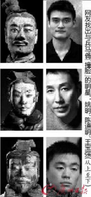 網友拼貼出的跟兵馬俑“撞臉”的幾位明星,從上到下為姚明、陳道明、王寶強,他們都被認為可以出演“兵馬俑俠”。