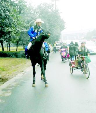 近日,一年輕男子騎馬上路的趣圖在微博、微信上悄然躥紅,其騎馬穿越塞車國道、闖入加油站買水、與私家車追逐的“幽默事跡”,令廣大網友留下深刻印象,並戲稱此男子為“馬上哥”。記者聯係到“馬上哥”姚某,他曾獲2013年中國馬術節四川省俱樂部馬術繞桶賽冠軍。姚某表示,他結婚以來第一次回丈母娘家,卻因買不到車票而苦惱。前一段時間,“馬上體”火爆網絡,于是他靈機一動想到了“馬上回家”這一方式,順便給老婆和丈母娘制造一個驚喜。