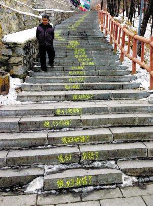 在每一個上下山石階與地面垂直面上,都用粉筆寫著相同的一句“媳婦我錯了”,道歉語伴隨著臺階從山腳一路向山上延伸。沿著寫有道歉語的臺階一路而上,到字跡結束的位置記者回頭一看山已經爬了近三分之一,粗略統計近300級臺階被“道歉”。