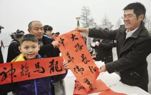 “我記得小時候,春聯都是每家自己寫,因為學書法,每逢過年,我最大的任務就是寫春聯,不僅給自己家寫,還要幫親戚鄰居寫,不過這些年都是在街上買了,很少看到還有人家自己寫春聯了。”市民黃楊說,聽說有書法家在孔學堂免費為市民寫春聯,他就帶著家人來了,“市面上賣的春聯或許很精致,但缺少一份人氣兒。”在黃楊看來,能在門前貼上一份書法家寫的還帶著墨香的春聯,很有“面子”。不同于其他活動的喧鬧,寫春聯的現場顯得特別的溫暖和諧:書法家們聚精會神地寫,市民們笑容滿面地等。滿頭白發的花甲老人攜帶印有“龍鳳呈祥”的花紋紅紙來祈求書法家揮墨書寫春聯;朝氣蓬勃的中學生得到上聯為“矢志不移,學業有成心願了”,下聯為“精誠所至,寒窗不負勤讀書”的新春佳聯;為市民書寫“福”字的書法家,還仔細地為市民講起了“倒貼福”的由來;還有一些孜孜以求的業余愛好者利用這個難得的機會和書法家們交流起書畫心得……“書法本就是中國的優秀傳統文化精華,希望今後能多在孔學堂這種中華文化氛圍厚重的地方開展寫春聯活動,讓更多的市民感受中國的書法國粹。”一位正在為遊客揮毫潑墨的書法家說。