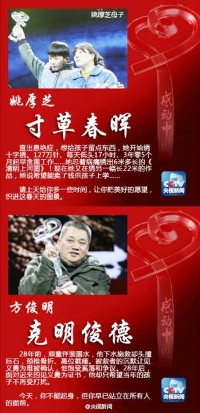 被譽為“中國人年度精神史詩”的電視公益活動——中央電視臺“感動中國2013年度人物”頒獎盛典昨晚在央視綜合頻道播出。