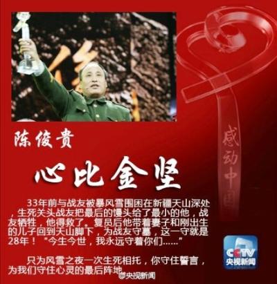 陳俊貴,男,漢族,55歲,新疆維吾爾自治區尼勒克縣喬爾瑪築路解放軍指戰員烈士陵園管理員。1979年,陳俊貴隨所在部隊到新疆參加修築天山深處杜庫公路的大會戰。1980年4月6日,部隊被暴風雪圍困在天山深處,面臨斷炊的危險。