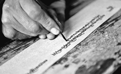 2月15日,46歲的阿昂尖措正在進行德昂灑智書法展示。在青海省果洛藏族自治州達日縣德昂鄉德昂寺,阿昂尖措將特制的竹筆在浸滿墨汁的刷子上輕輕一潤,一個個清雋的藏文字母便從筆尖流出,整齊流暢,倣佛印刷一般。