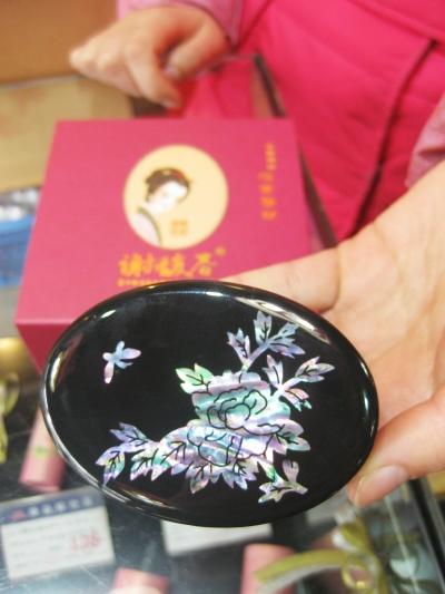 記者看到,一款羊胚胎素禮盒中,一個半八卦形狀的刮痧板取材加拿大碧玉,玉上印有謝馥春的商標。而另一款則是用漆器盒包裝的謝馥春香粉,漆器盒採用點螺工藝制作。