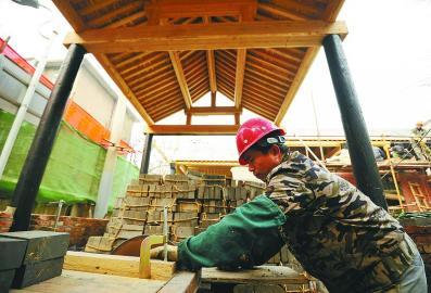 昨天,在南新街58號老舍舊居修繕現場,工作人員在按照史料記載的舊居原貌進行施工,目前重建房屋的木結構框架已搭建完成。據了解,自去年11月開始老舍舊居修繕工作進入原貌恢復重建階段。此次修繕採用技術手段將老舍舊居恢復到上世紀三四十年代傳統民居風貌,使修繕後的老舍舊居與南新街這條濟南著名的文化街完美融合。修繕後的老舍舊居將設立以老舍先生在濟南的生活創作為主題的紀念館,供市民參觀學習。(本報記者 崔健 攝)