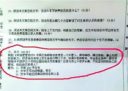 據@王小呆同學稱,這是近日成都某中學的語文試題,這作文題目真是喪心病狂啊!給理科生們點根[蠟燭] !網友建議答案:將千頌伊殺害後做成標本泡在福爾馬林中帶回自己星球成為自己永遠的愛的珍藏。把制作保存標本的方法拓展開就有800字了…太血腥了!