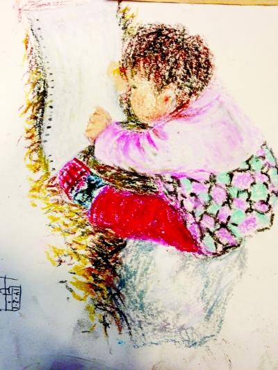 家住南湖的雷女士,總是隨身帶一本畫冊和若幹油畫棒,一有空閒她就會拿起畫筆,為1歲9個月的女兒畫像記錄成長。