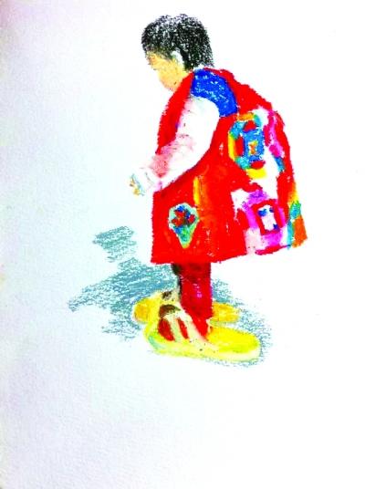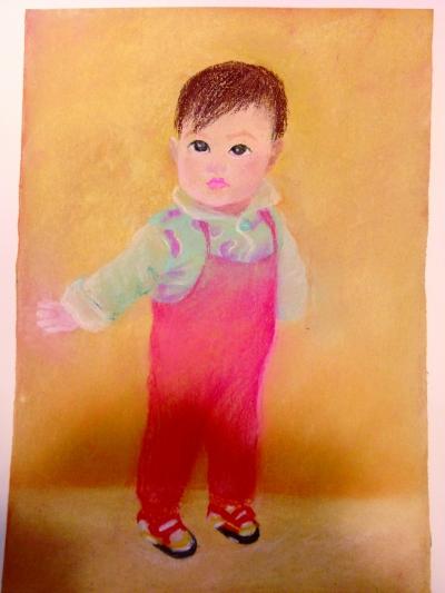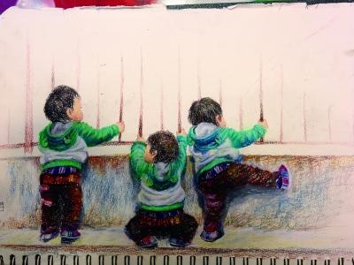 在一次工作空閒時,雷女士拿起油畫棒,將女兒扶牆而立的樣子畫了下來。“當時的環境特別單調,孩子穿的衣服也是冷色調,照相不一定精彩。”雷女士將背景畫成了暖色調,還給孩子“穿”上了紅色背帶褲,俏皮的裝扮加上呆萌的眼神,整幅畫既可愛又溫馨。