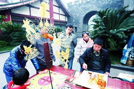 遊客圍觀劉貴兵制作糖畫 記者 龍在全 攝