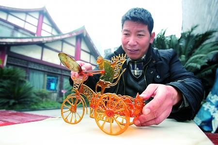 昨日,巴國城,糖畫傳承人劉貴兵展示剛制作好的“3D”糖畫。記者 龍在全 攝