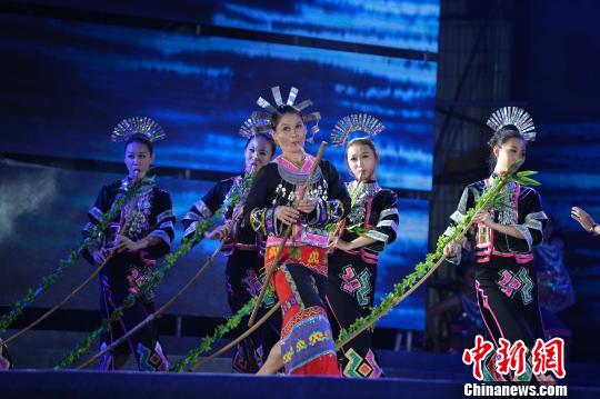 圖為文藝晚會上瓊海市代表隊表演苗族舞蹈《繡女翩翩》。 駱雲飛 攝