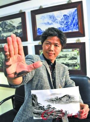 當年18歲的歐文是小彩瓷廠小學徒,開過店,擺過地攤。不過20多年來,他一直沒有放棄常人眼中的“旁門左道”——手掌作畫。現在,他終于有所成就。昨日上午,他被廣州輕工技師學院國家級技能工作室吸納為“大師級”成員,並有了自己的工作室,不必再以擺攤謀生了。