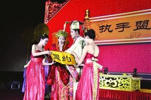 《揚子晚報》消息 近日,《武媚娘傳奇》熱播,南京一家婚禮策劃公司從中嗅到了商機,策劃了一套夢回大唐主題婚禮,25日,這家婚慶公司辦了一場婚禮秀。