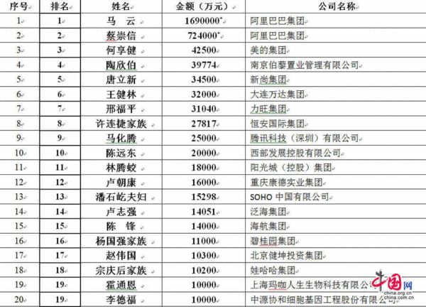 中國網2月6日訊(記者 張艷玲)2月6日,北京師范大學中國公益研究院發布《2014中國捐贈百傑榜》,榜單顯示,馬雲因捐贈個人持有價值超過169億元的阿里巴巴股份而位居榜單第一,蔡崇信以72.4億元的額度排名第二,何享健以4.25億元的捐贈額排名第三。這是該機構連續第四年發布該榜單。