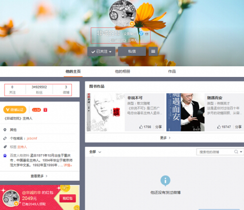 孟非具有3492萬余名粉絲的個人所有微博信息突然全部消失,所有關注被取消,且博主易名為“非誠的非”,與此同時,其一直被認為是孟非小號的微博、有15萬粉絲的“孟小發的生活”微博上則曬出了18歲愛女的生日靚照,並祝福“蘋果18歲生日快樂”。