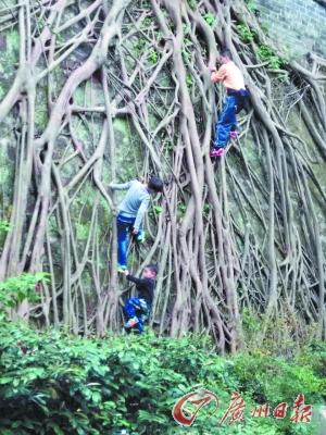 3個熊孩子在爬榕樹根。廣州日報記者李波 通訊員曾錦銳 攝