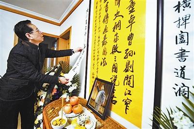 本報訊(記者 崔巍)當北京青年報記者昨天下午16時許趕到袁闊成位于馬連道附近的家時,家中已經設置了一個小小的靈堂。靈堂陳設非常簡單,只擺了一盤蘋果、一盤點心和一個用來上香的小碗,小桌兩旁是中國曲藝家協會送來的花籃,上方懸挂著他的義子、著名曲藝家崔琦書寫的挽聯:巨擘千古縱橫捭闔書道闊,大師百年評說善惡藝風成。崔琦介紹說,秉承袁先生一直以來的低調作風,家人和弟子們本來沒打算在家設靈堂,希望一切從簡,但後來考慮到還是會有親朋好友和媒體朋友前來吊唁,這才臨時布置的,而且因為先生去得突然,連遺像都還未及準備,所以只放了一張他平時就擺在家里的、年輕時的舞臺表演照片。