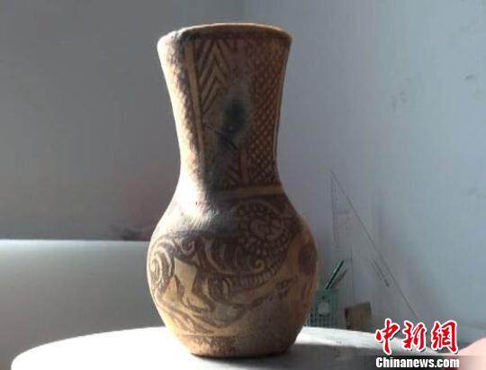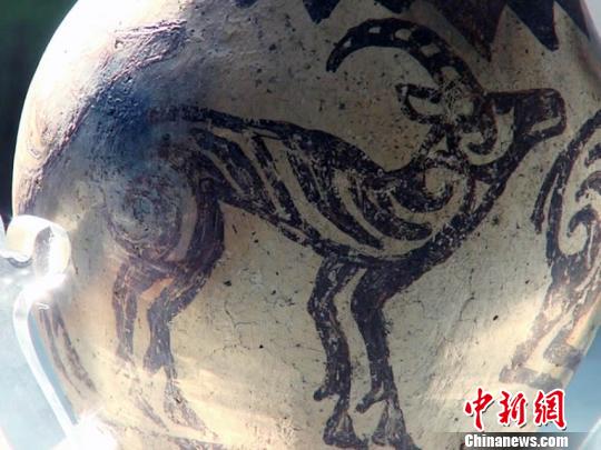 記者了解到,首次發現的五羊紋彩陶,瓶頸部分有菱形、三角形幾何圖案,瓶身部分飾以一只跪臥狀的盤羊、一只小羊、三只站立的大羊。彩陶造型別致,圖案精美,五只羊體態健壯,昂首仰望;整體畫面以靜為主,靜中有動。
