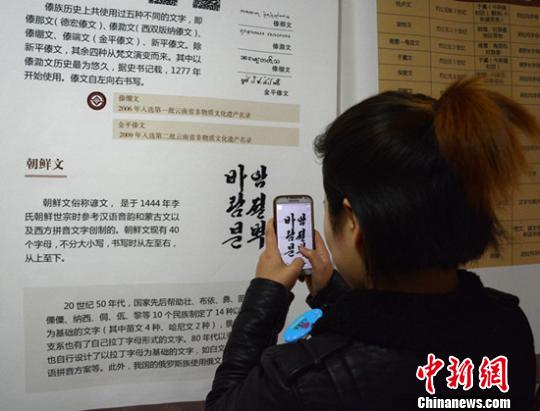 當地市民正在用手機記錄“我們的文字——非物質文化遺產中的文字傳承”展出內容。 廖奇琪 攝