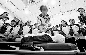 �昨天,參觀市民在學習日常急救方法。