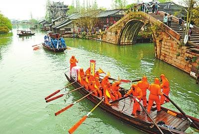近日,江蘇、浙江兩省3市13古鎮聯合申遺工作全面啟動,將于2017年3月底前向國家文物局提交申報文本,力爭“十三五”期間完成申遺目標。圖為在浙江省嘉興市烏鎮舉行的“烏鎮香市踏白船”民俗活動(4月6日攝)。 新華社發