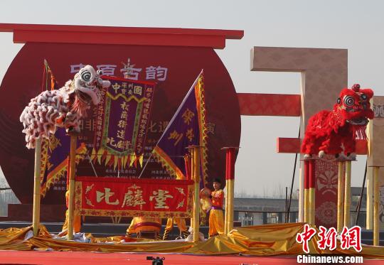 中新網鄭州3月14日電(記者 齊永 李貴剛)藤縣獅舞、京西太平鼓、越調、長調呼麥、絳州鼓樂……這些國家級非遺項目,14日上午在河南淮陽千年古廟會上逐一登臺亮相。