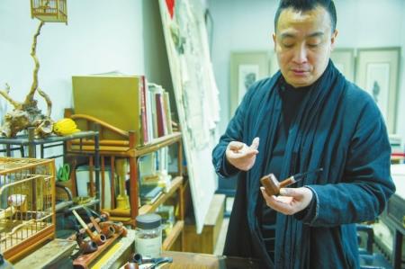 這個鳥籠托盤里隨意放了幾十只煙鬥,作畫的時候馬勇就隨意取出一只來抽上一鬥。