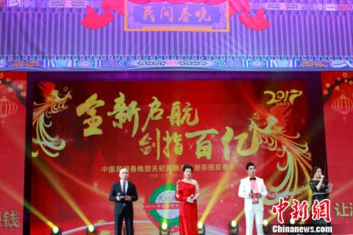 中新網1月12日電 日前,由天杞園中國民間春晚組委會打造的天杞園2017年中國民間春晚錄制完成。此次中國民間春晚以傳承民間文化、弘揚國粹精華、發掘原生態藝術為設計理念,致力于呈現一臺陣容強大、跨越藝術與主流的新年祈福盛宴。