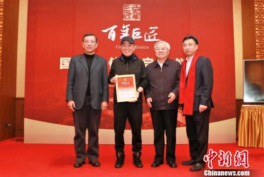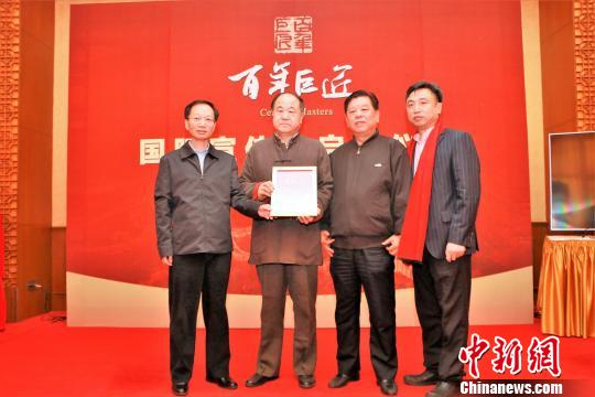 全國政協外事委員會副主任、國家藝術基金理事會理事長、《百年巨匠》總顧問蔡武(右二),中國藝術研究院院長、中國非物質文化遺產保護中心主任、《百年巨匠》出品人連輯(左一),為張藝謀頒發《百年巨匠》國際宣傳片總導演聘書。主辦方供圖