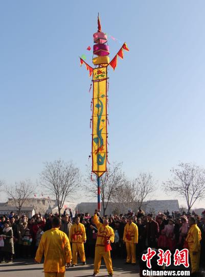 中新網石家莊2月12日電 (郝燁俱凝搏)鼓點響起,51歲的史文水單手托起碗口粗、近36公斤重的幡旗一端,猛然用力向上一拋,12米高的幡旗便穩穩地豎立在他的頭頂,動作一氣呵成,扣人心弦。
