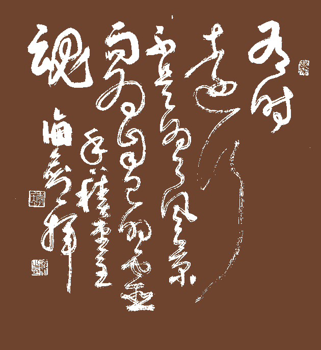 海劍先生的草書巨大成就是在博採眾家之長的基礎上取得的,他取張芝、“二王”、王鐸、懷素等名家之長,並在飄逸、情趣等方面苦下功夫,最終獨立風范,使自己的草書上升到很高的美學高度。他說,藝術源于生活,高于生活。書之妙道就是寫性情、寫涵養、寫豐富的大自然、寫變化多姿的萬物景象……滄桑老街的屋漏,雨水順牆下流,順凹凸不平的牆面蜿蜒下注,形成頓挫有力的痕跡。書法應當追求這樣的藝術效果,用線條來啟迪人的心靈。