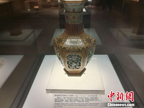 “我看過好幾個展覽,乾隆爺時代的瓷器總讓人看得眼花繚亂,特別扎眼。”來觀展的老張一口流利的北京話,“這個‘六方瓶’吧,是那會九種夾層玲瓏瓶里的一種,看著顏色俗艷俗艷的,但成型工藝特別復雜,很難做出來”。