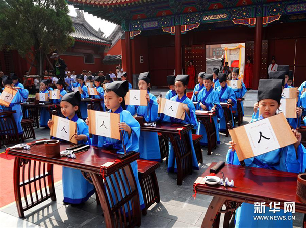 9月7日,在山東省即墨文廟,身著漢服的小學生展示自己書寫的“人”字。教師節來臨之際,山東省青島市即墨文廟舉行丁酉年學童開筆禮儀式,40多名身穿漢服的小學新生在老師的見證下,通過正衣冠、拜師行禮、朱砂啟智、擊鼓明志、啟蒙描紅等儀式,接受中國優秀傳統文化的熏陶,勉勵自己讀書、識字、達禮。新華社發(寧友鵬 攝)