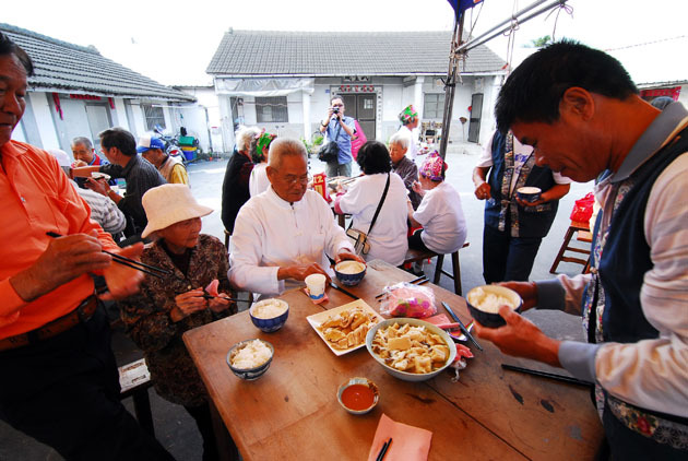 重現客家先民刻苦、合作精神,臺東縣關山鎮新埔小區27日舉辦消失40多年的“走桌婚宴”,小區民眾在宅院前圍坐古老方形桌,品嘗客家菜。(圖片來源于臺媒)