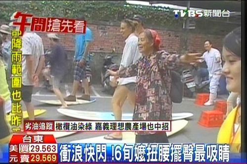據臺灣TVBS網站報道,2013臺灣衝浪公開賽14日將在臺東展開,13日有10名選手舉行快閃活動,拿著衝浪板在路上假裝衝浪,超市的員工也拿著購物籃充當衝浪板,場面相當逗趣,其中還有一位60歲的阿嬤也來加入衝浪的行列。